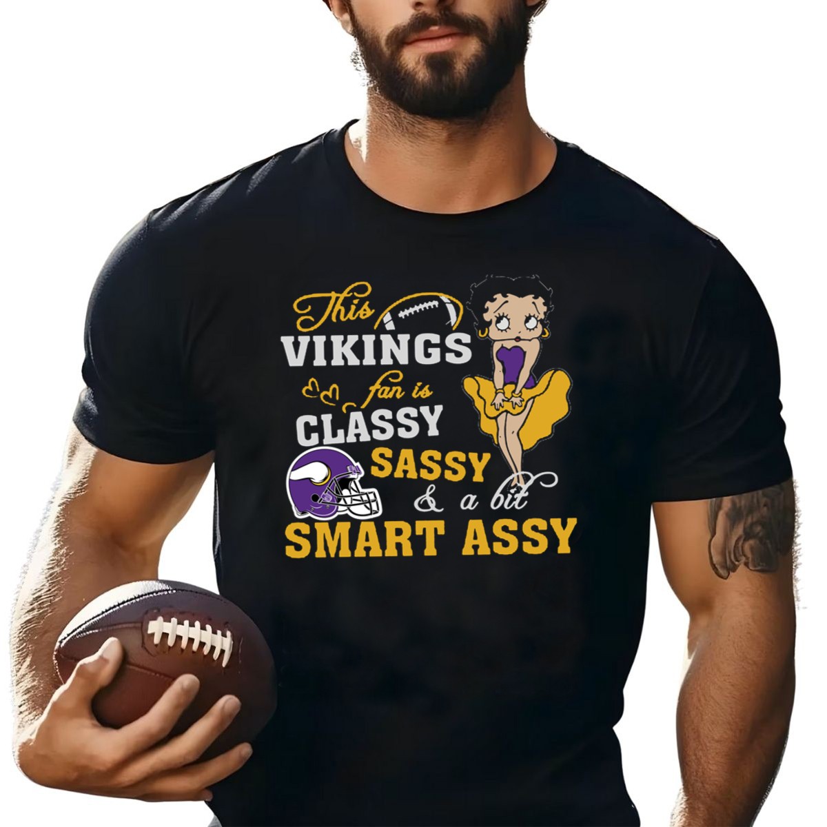 Show off your Minnesota Vikings pride with this stylish and humorous “This Minnesota Vikings Fan Is Classy Sassy And A Bit Smart Assy” T-shirt! Perfect for die-hard fans who love to blend team spirit with a touch of personality, this shirt is ideal for casual outings, themed events, or simply lounging at home. Made with a fan-made design, this shirt is printed in the USA, ensuring quality and uniqueness that every Vikings supporter will appreciate.