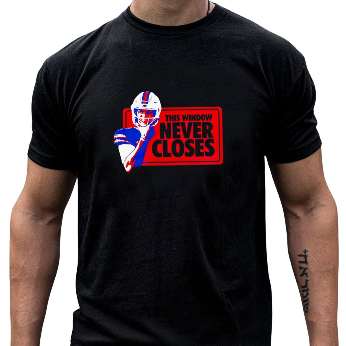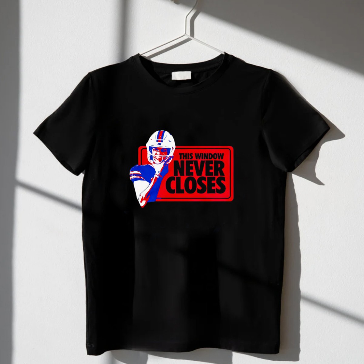 Show your unwavering support for Josh Allen and the Buffalo Bills with this unique fan-made T-shirt that captures the spirit of the game. Perfect for die-hard fans, this classic fit tee is ideal for casual outings, themed events, or simply cheering from the comfort of your home. With its vibrant print and top-notch quality, it’s a must-have for anyone who believes that this window never closes on the Bills’ journey!
