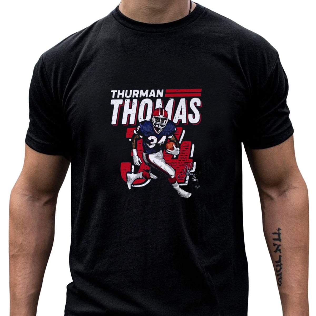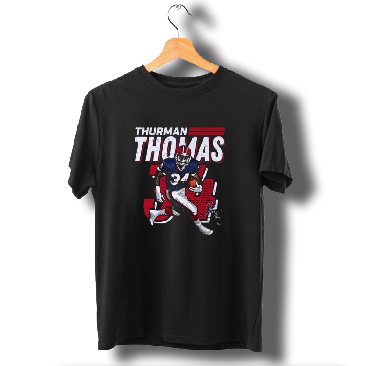 Show your support for the legendary Thurman Thomas and the Buffalo Bills with this fan-made graphic printed T-shirt. Perfect for die-hard NFL fans, this classic tee combines comfort and style, making it ideal for casual outings, themed events, or just hanging out with friends. Featuring a unique design that celebrates one of the greatest running backs in football history, this shirt is a must-have for every Bills supporter.