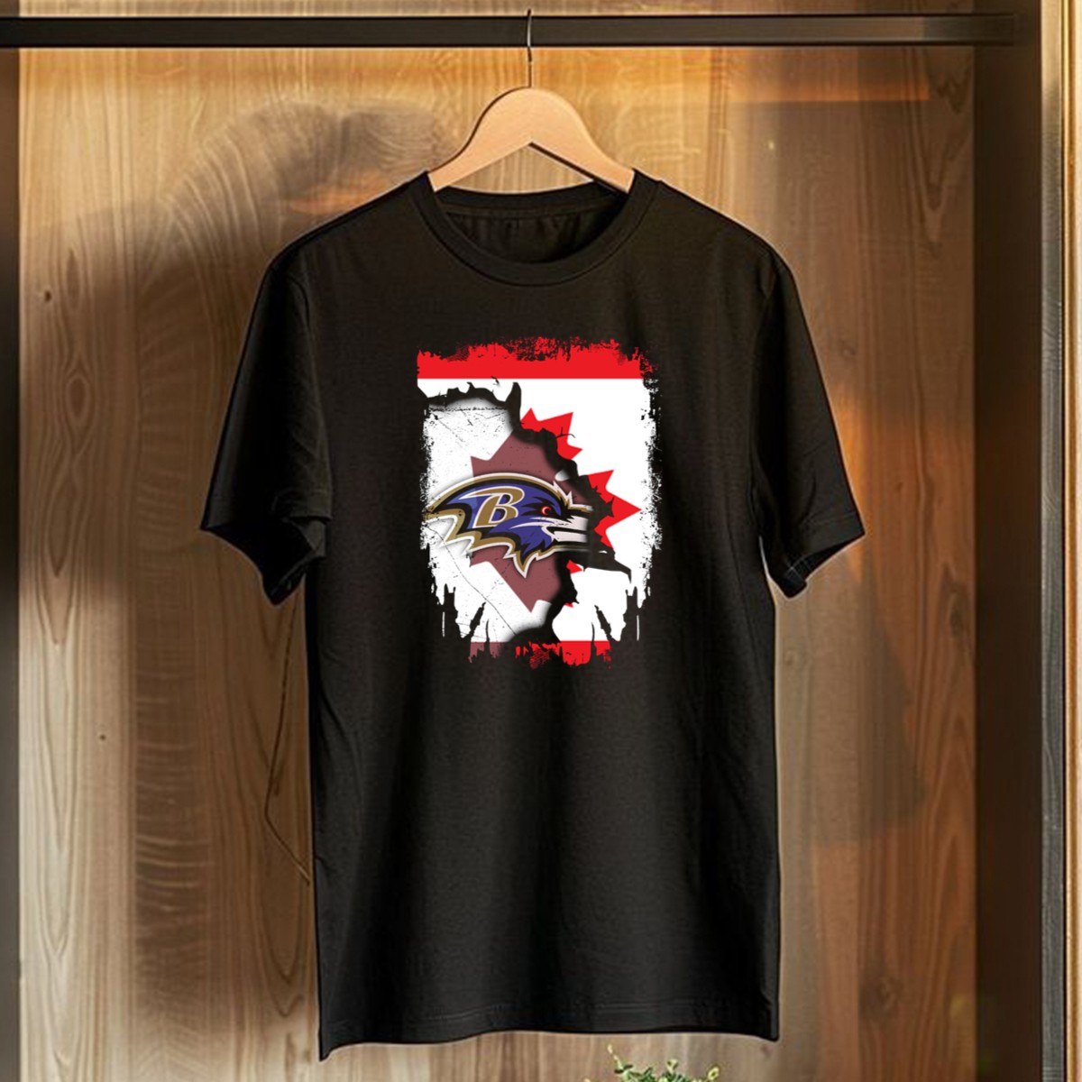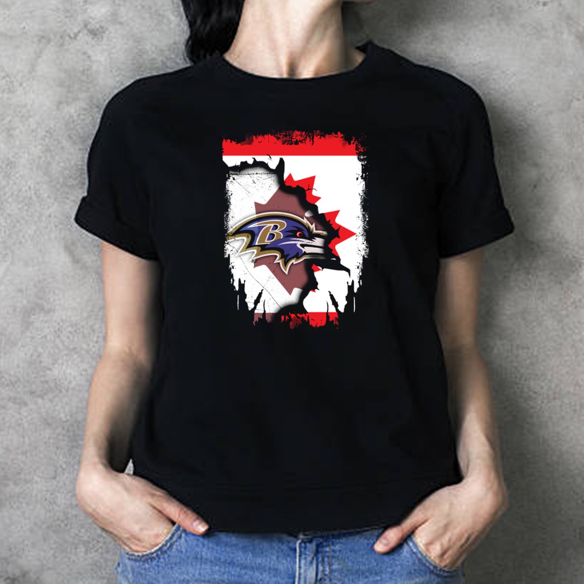 Show your love for the Baltimore Ravens and your Canadian pride with the Together Canada Baltimore Ravens Logo Canadian Flag T-Shirt! This fan-made design is perfect for die-hard supporters and casual fans alike, making it an ideal choice for game days, themed events, or just lounging around. With its unique blend of sports fandom and national pride, this shirt will surely make you stand out wherever you go!
