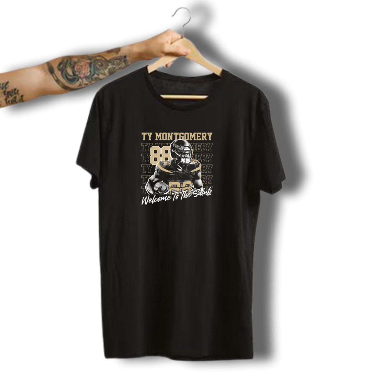 Celebrate your love for Ty Montgomery and the New Orleans Saints with this stylish fan-made graphic T-shirt! Perfect for die-hard fans and casual supporters alike, this shirt is a must-have for game days, themed events, or just lounging around. Crafted for comfort and style, it showcases a unique design that proudly displays your team spirit while ensuring you stay comfortable all season long.