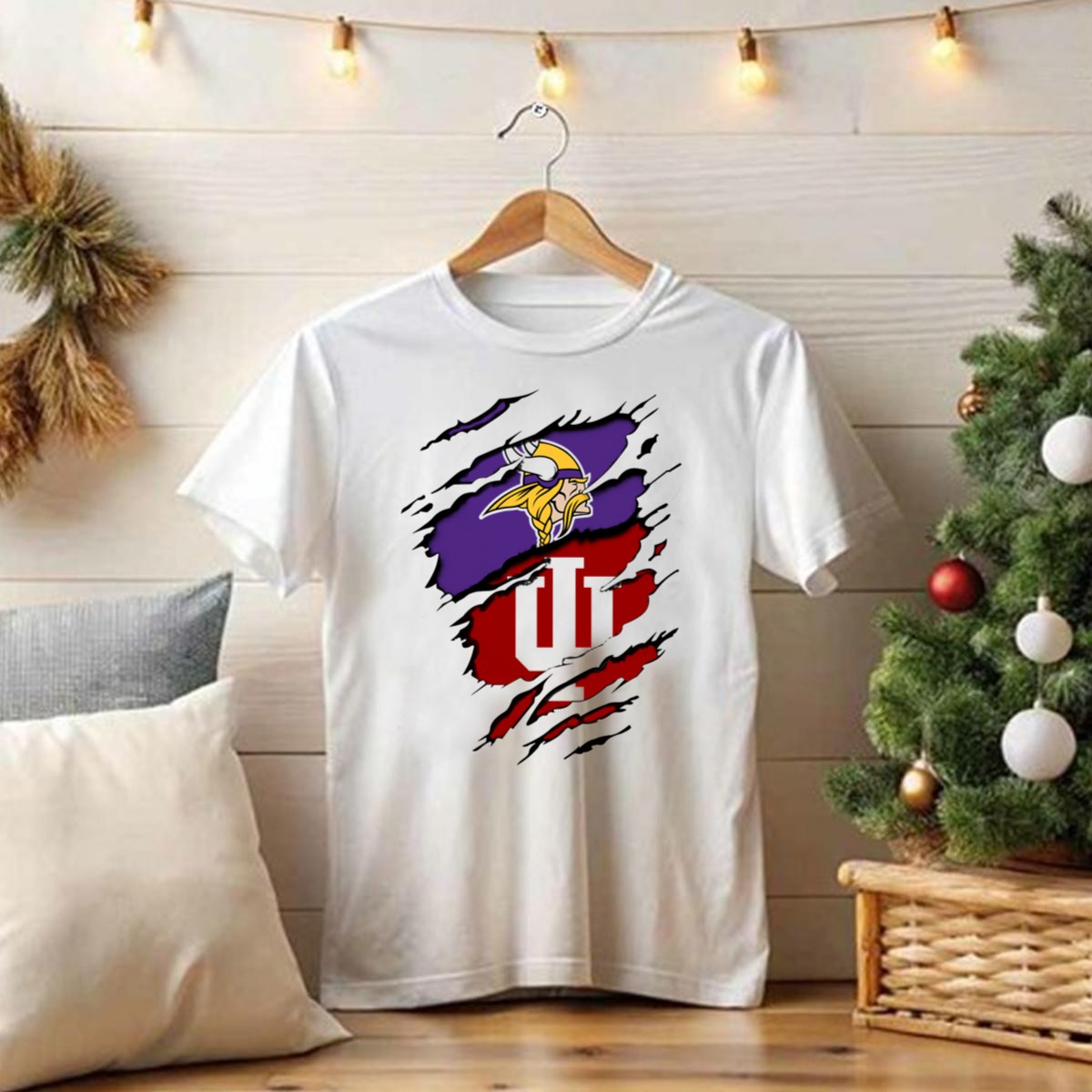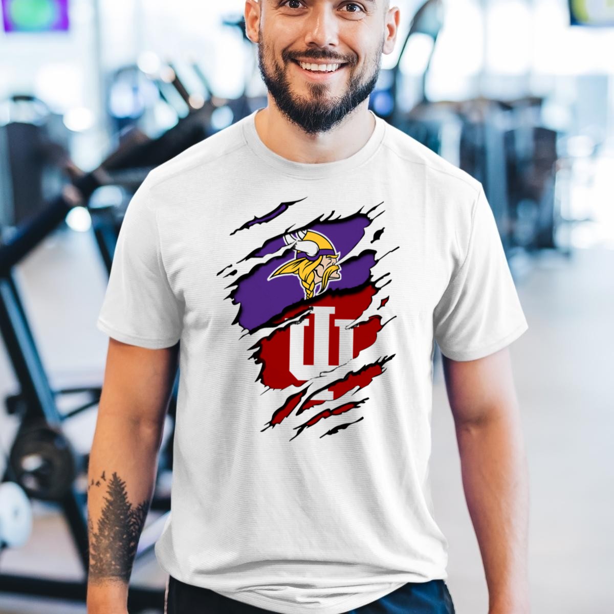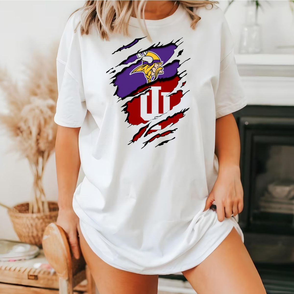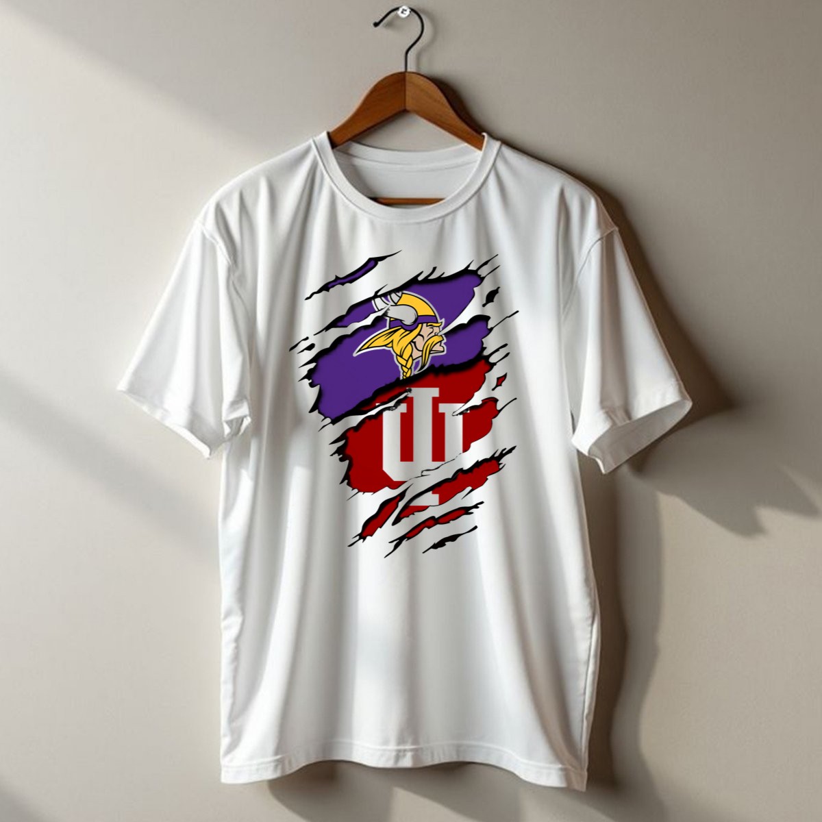 Show off your team spirit with our Vikings Indiana Hoosiers Torn Logo Mashup T-Shirt! This fan-made design is perfect for dedicated sports enthusiasts and makes a bold statement during casual outings, themed events, or even daily wear. Made with soft and breathable fabric, this classic fit t-shirt combines comfort and style, making it an ideal choice for any season. Proudly printed in the USA, this shirt is a must-have for anyone looking to support their favorite teams in a unique way.