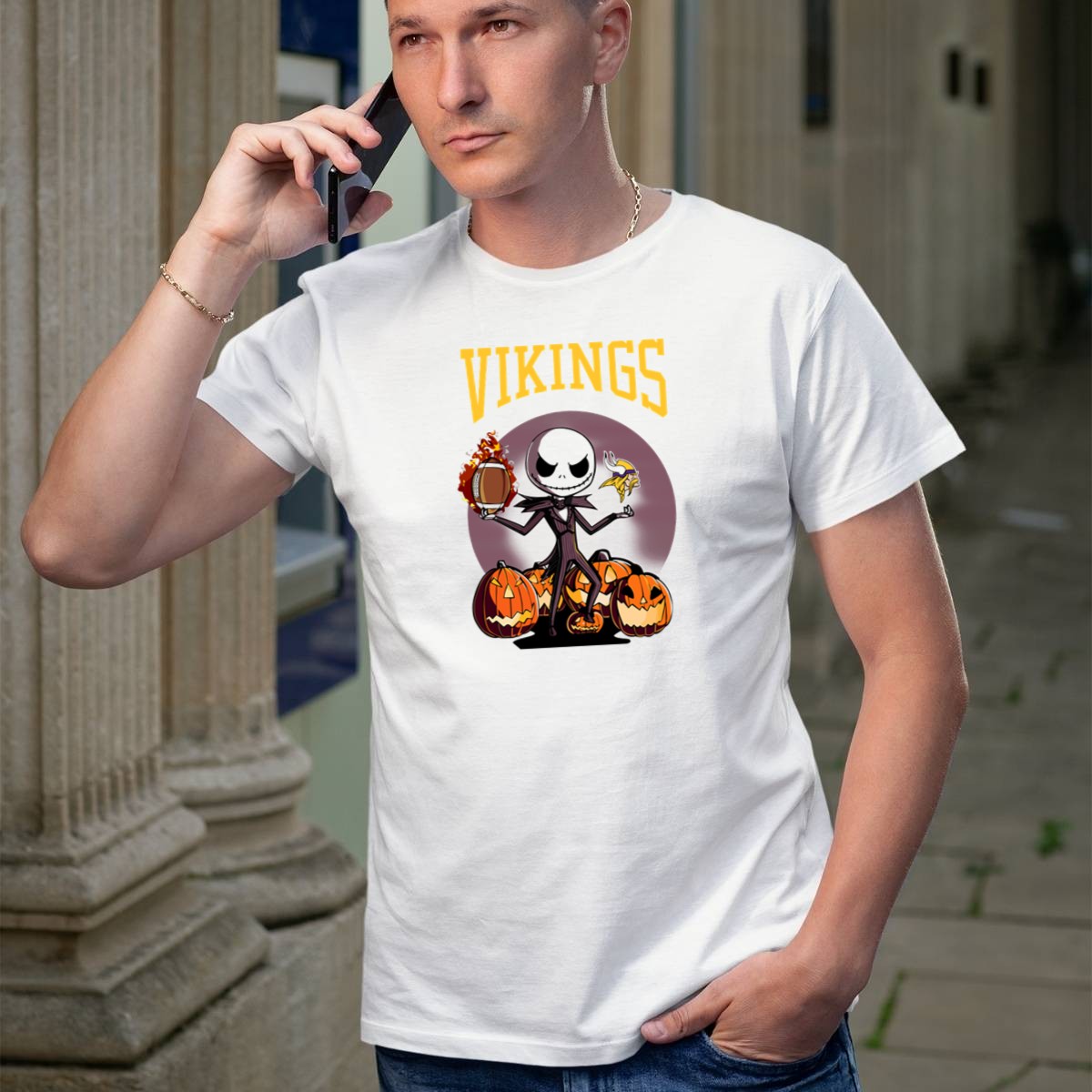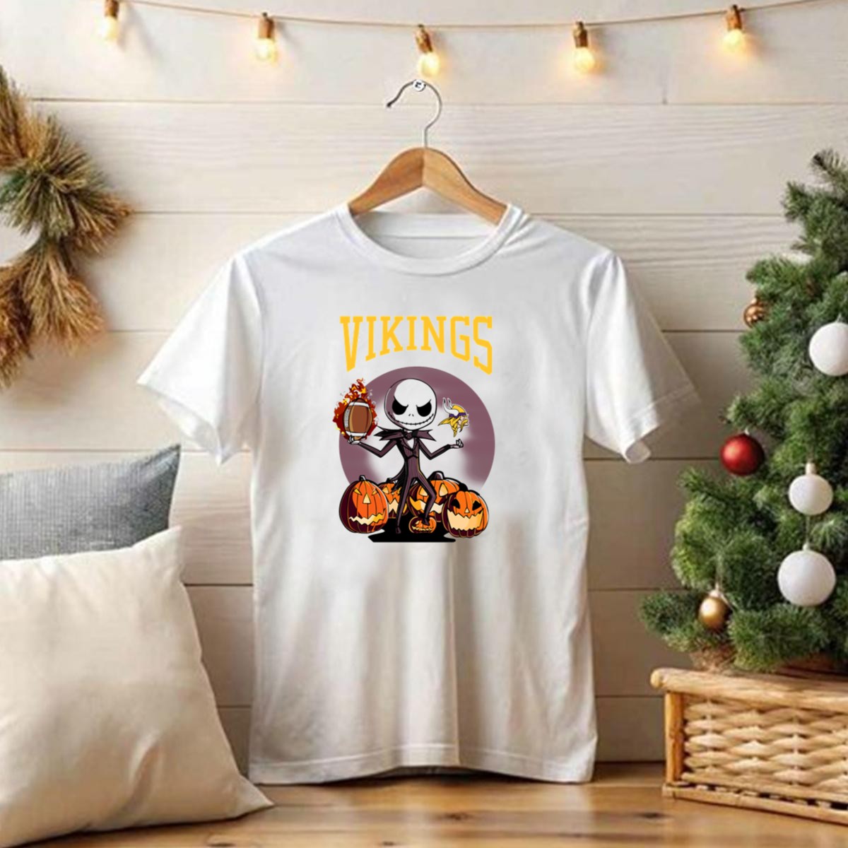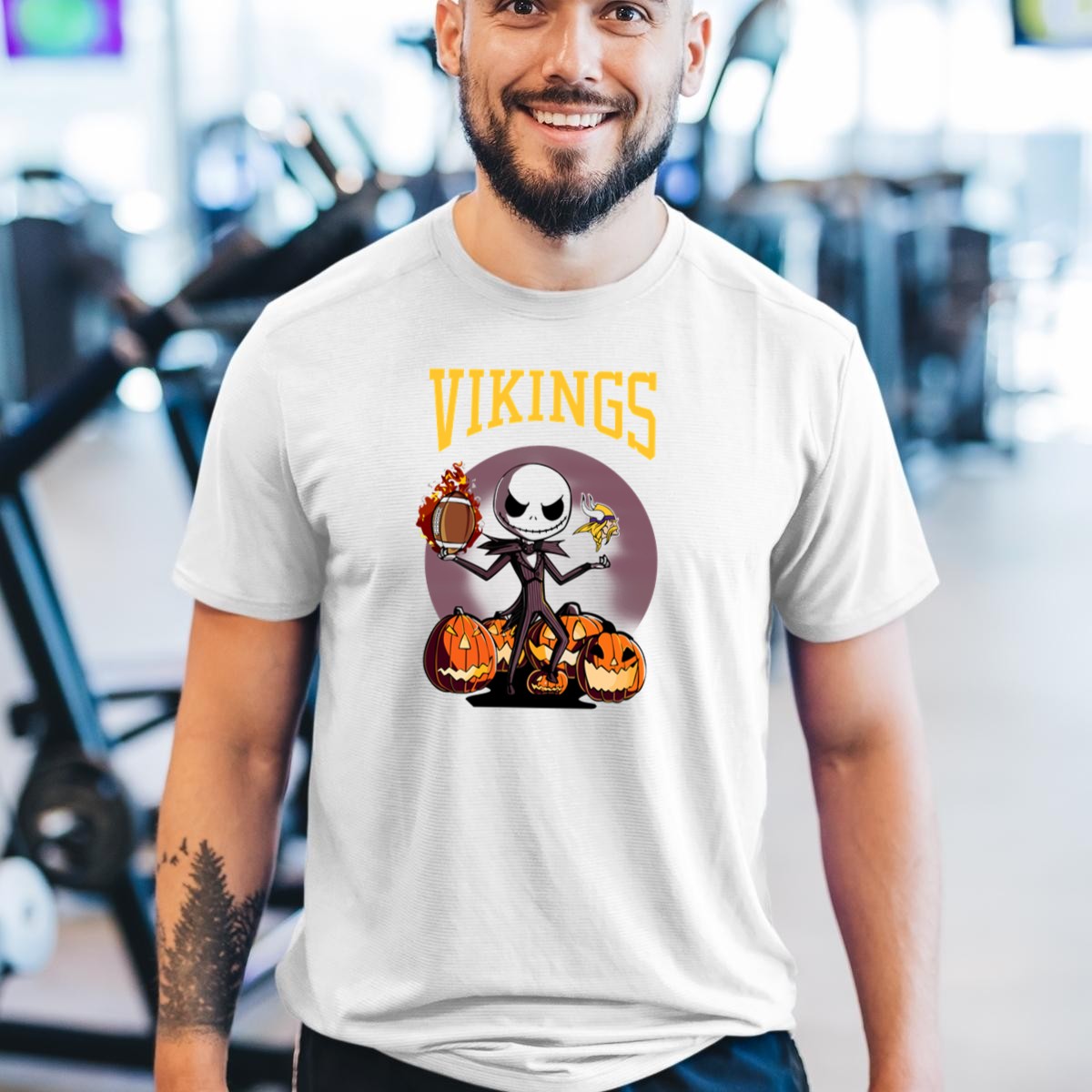 Embrace the spirit of Halloween and football season with our exclusive Vikings Jack Skellington T-shirt! This fan-made design captures the enchanting essence of Jack Skellington while celebrating your favorite team. Perfect for themed events, casual outings, or daily wear, this shirt combines comfort with a whimsical touch, making it a must-have for any fan looking to showcase their love for both Halloween and football in style.