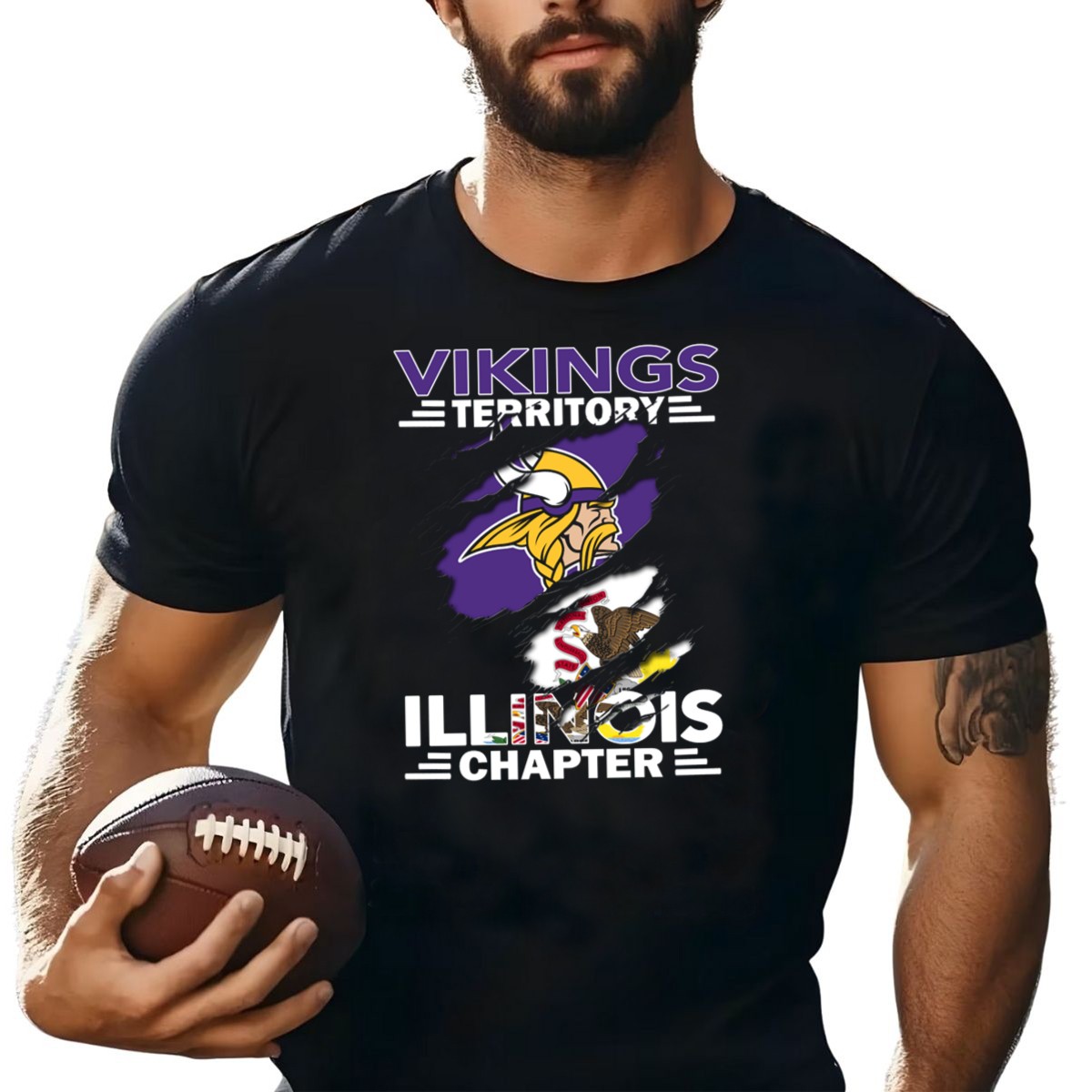 Show your pride for the Vikings Territory Illinois Chapter with this uniquely designed T-shirt, perfect for fans and supporters alike. Made for casual wear, themed events, or daily outings, this shirt features a bold Vikings logo set against the Illinois flag, making it a standout addition to any fan’s wardrobe. Crafted for comfort with a classic fit, this shirt is not just stylish but also a fantastic way to represent your team spirit wherever you go.