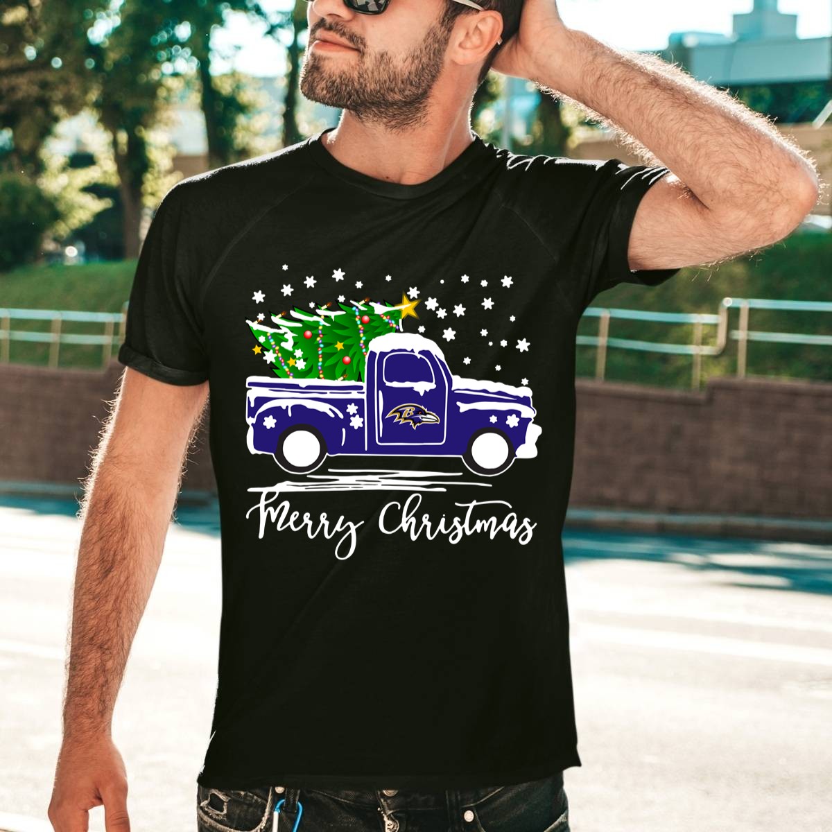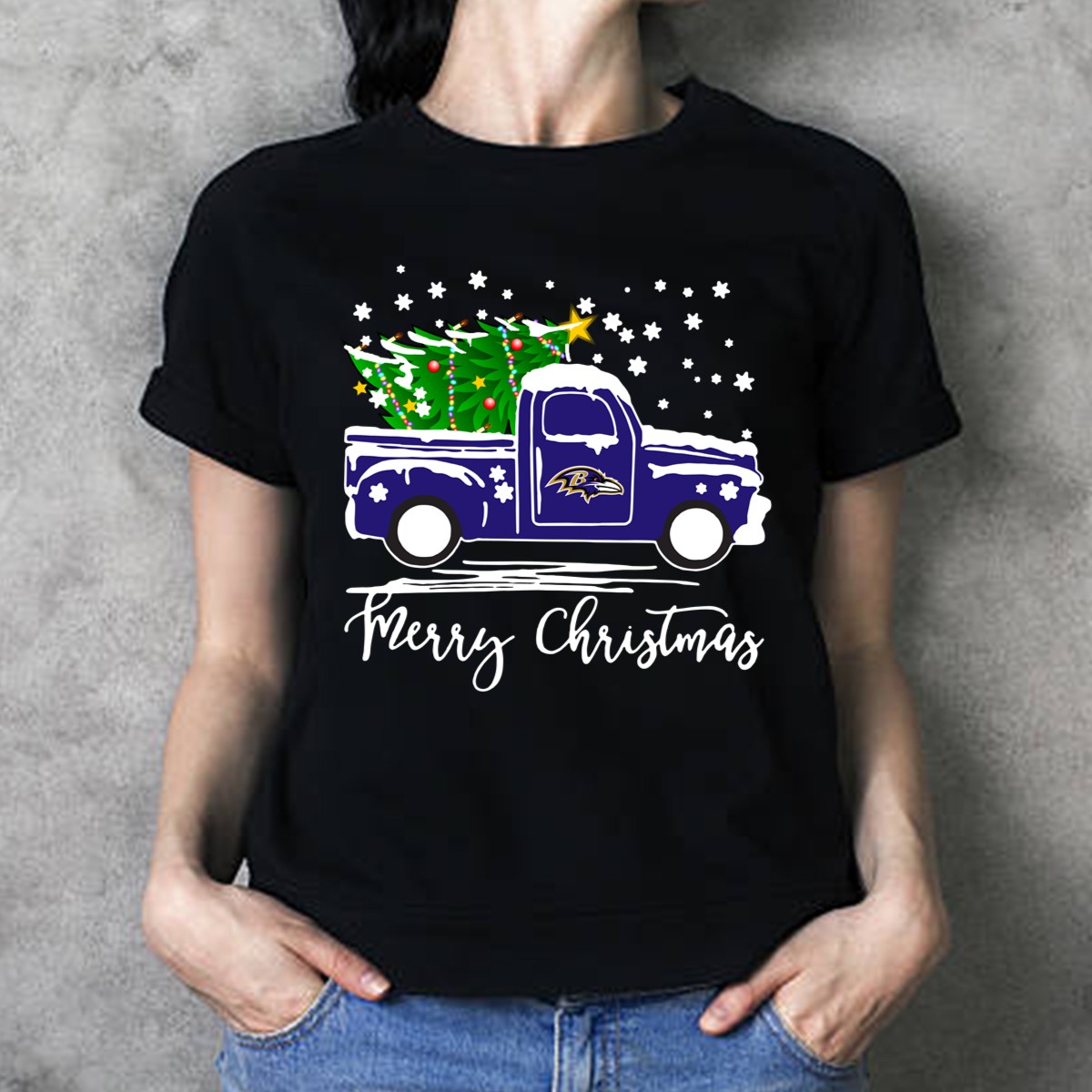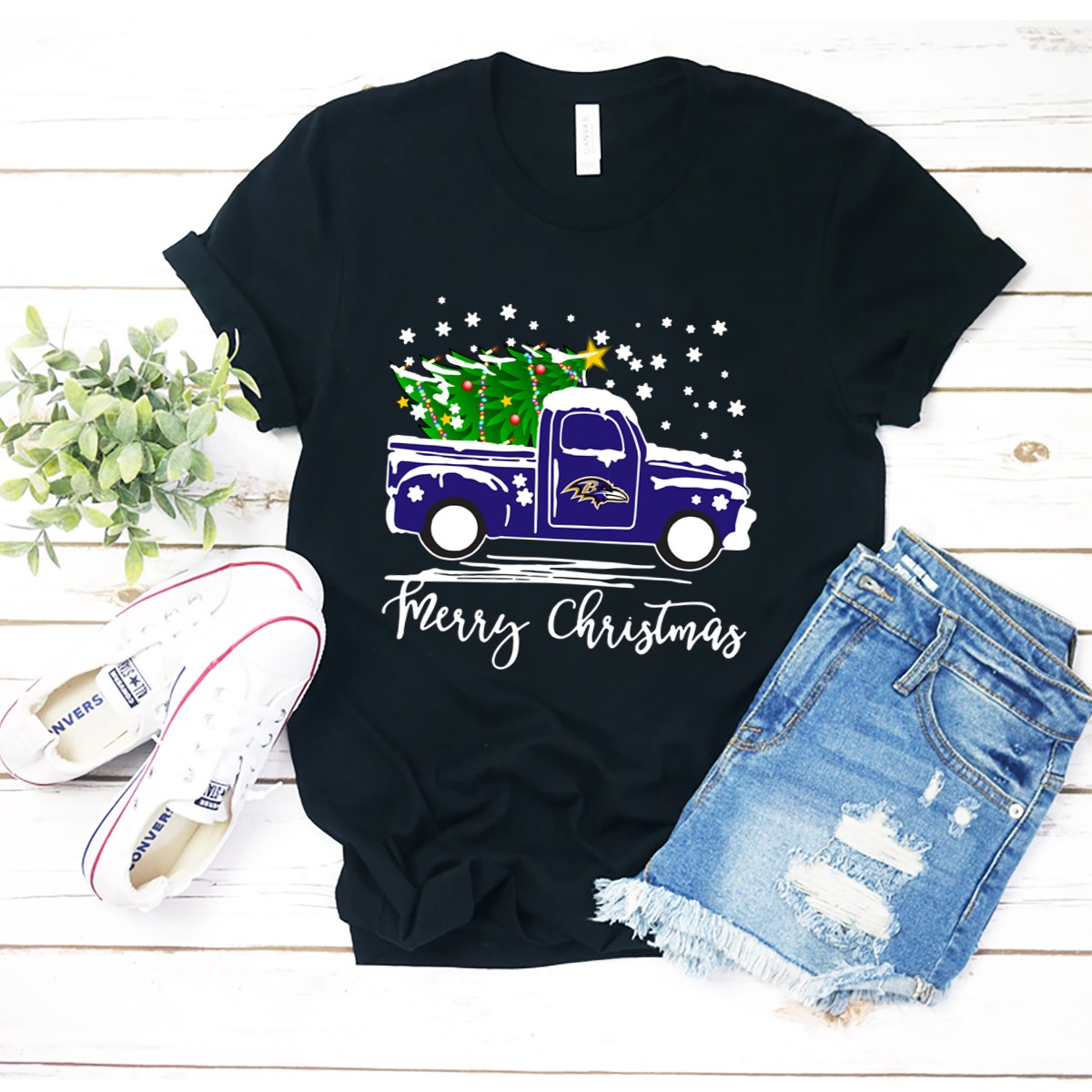Vintage Car Carrying Christmas Tree Baltimore Ravens Merry Christmas T-Shirt