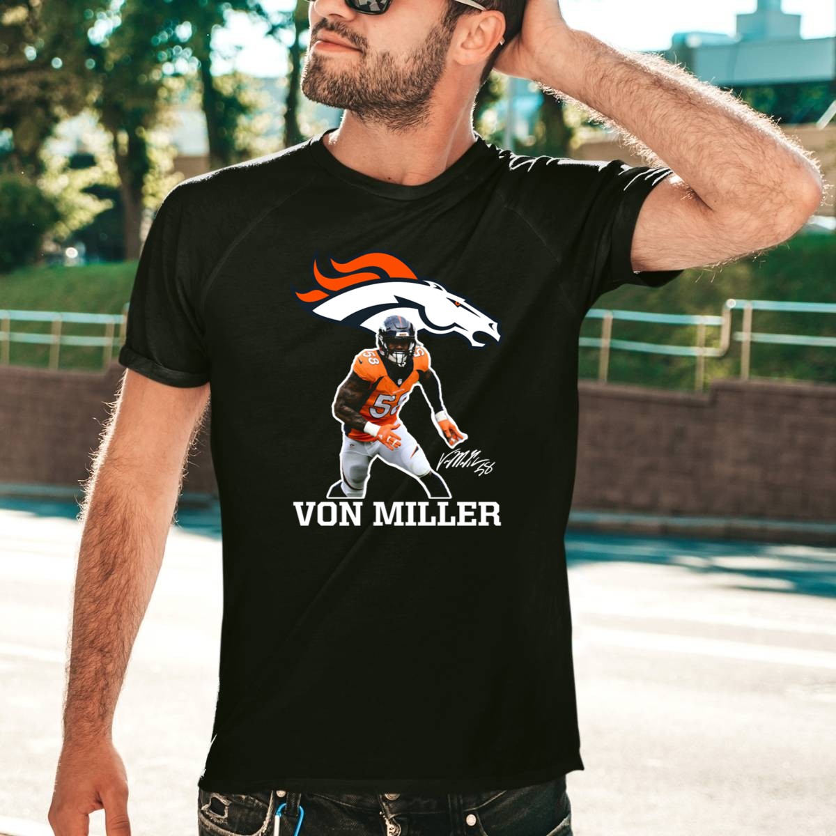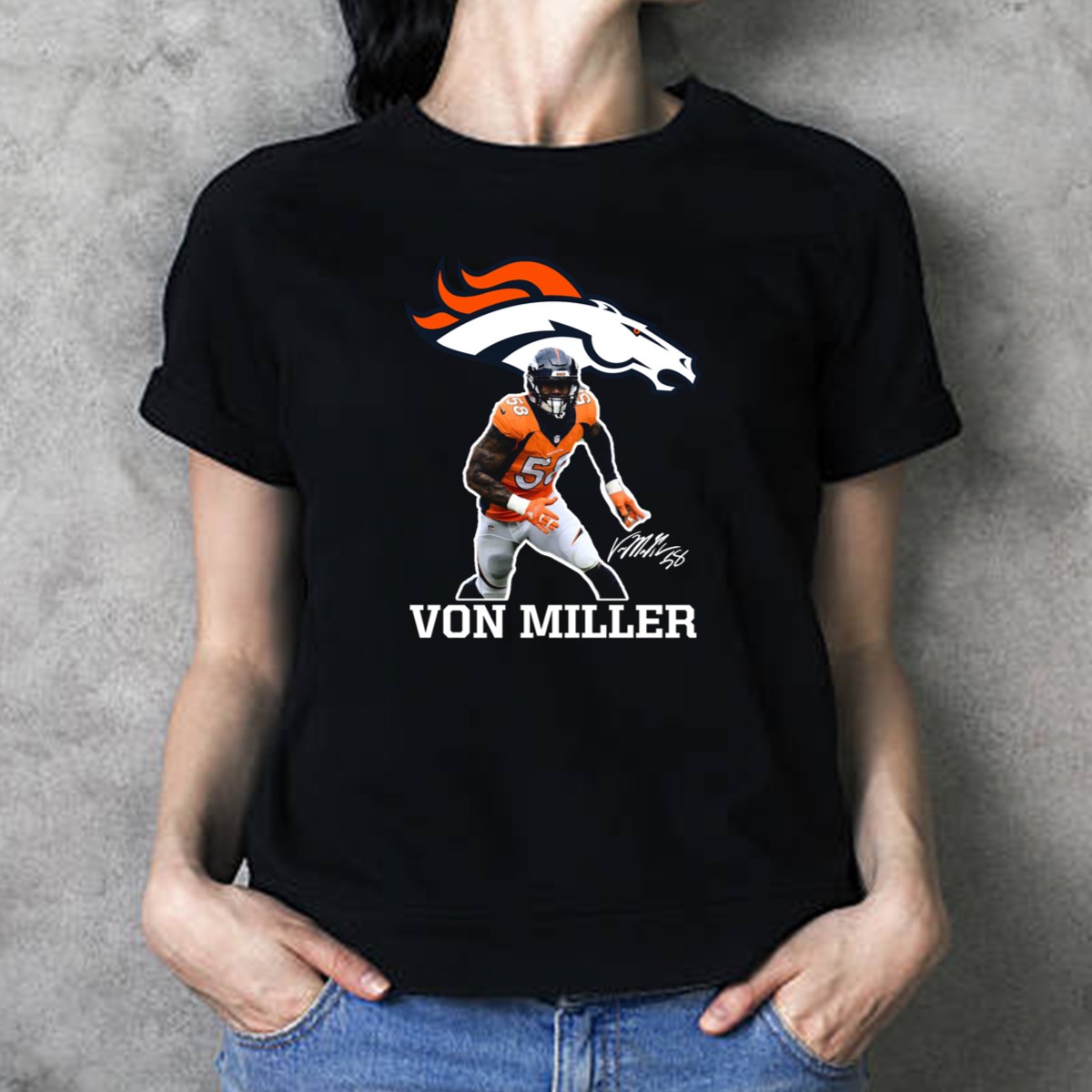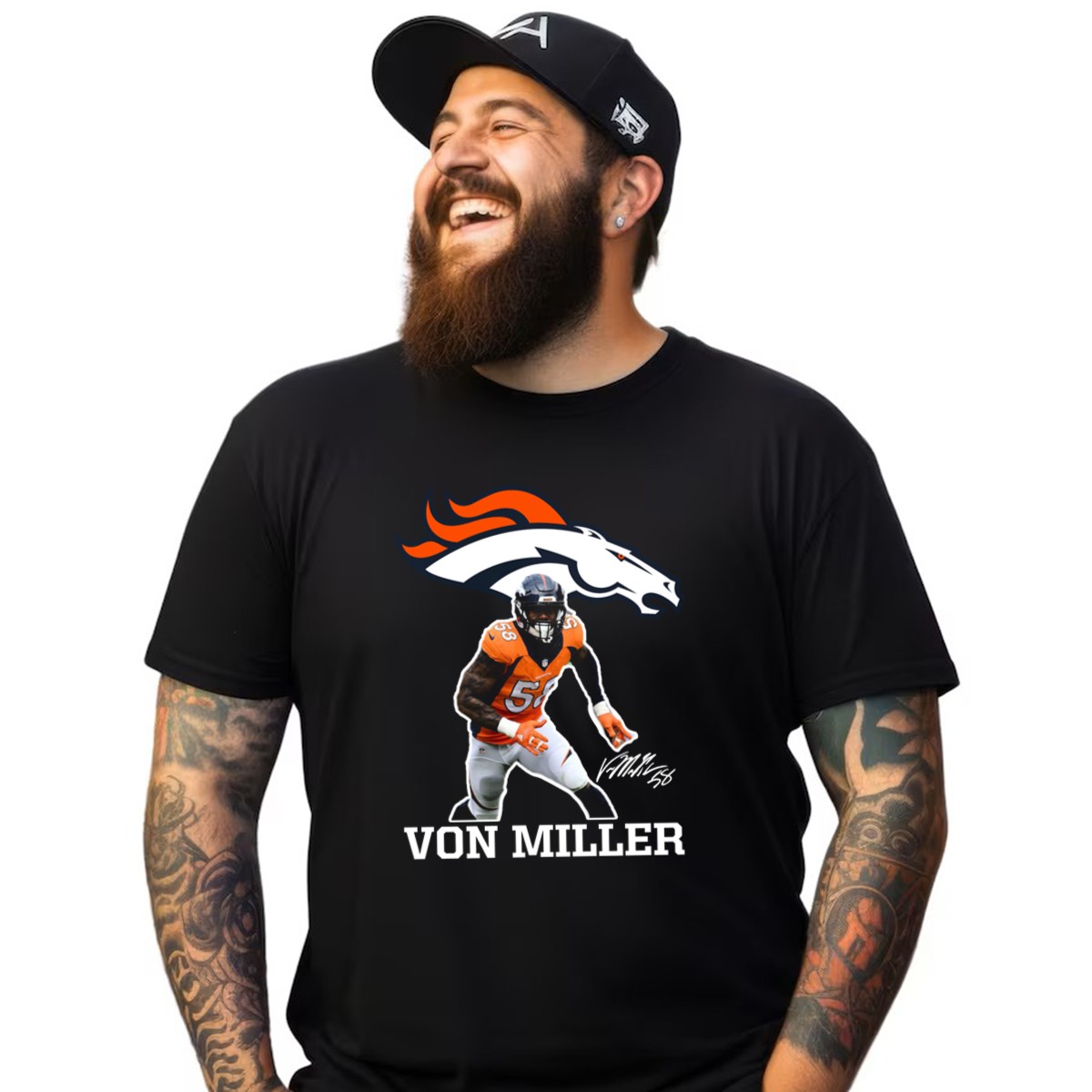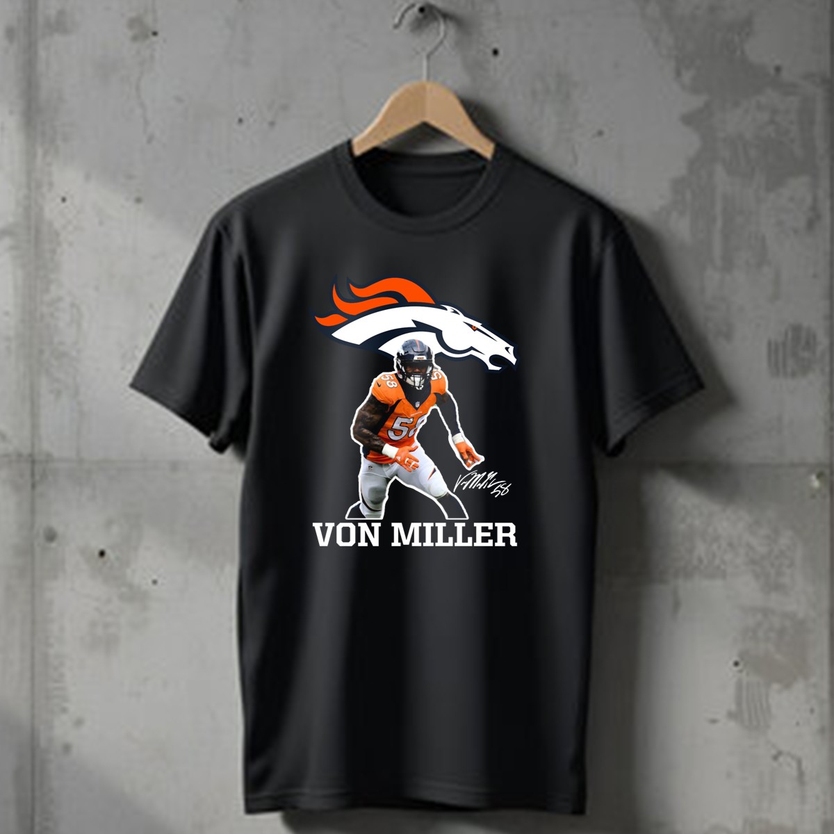 Show off your love for the Denver Broncos and legendary player Von Miller with this stylish and comfortable Gildan 5000 Unisex T-Shirt. Ideal for fans of all ages, this shirt is perfect for casual outings, themed events, or just lounging around at home while cheering on your team. The fan-made design is printed in the USA, ensuring a unique piece that stands out in any crowd.