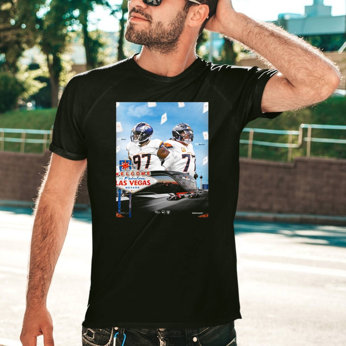 Celebrate your love for the Denver Broncos with our Week 12 Roach and Meinerz graphic T-shirt, designed for true fans! This shirt is perfect for game day, family gatherings, or casual outings, showcasing your team spirit while embracing the vibrant energy of Las Vegas. Made right here in the USA, this unique fan-made design combines comfort and style, making it a must-have addition to your wardrobe.