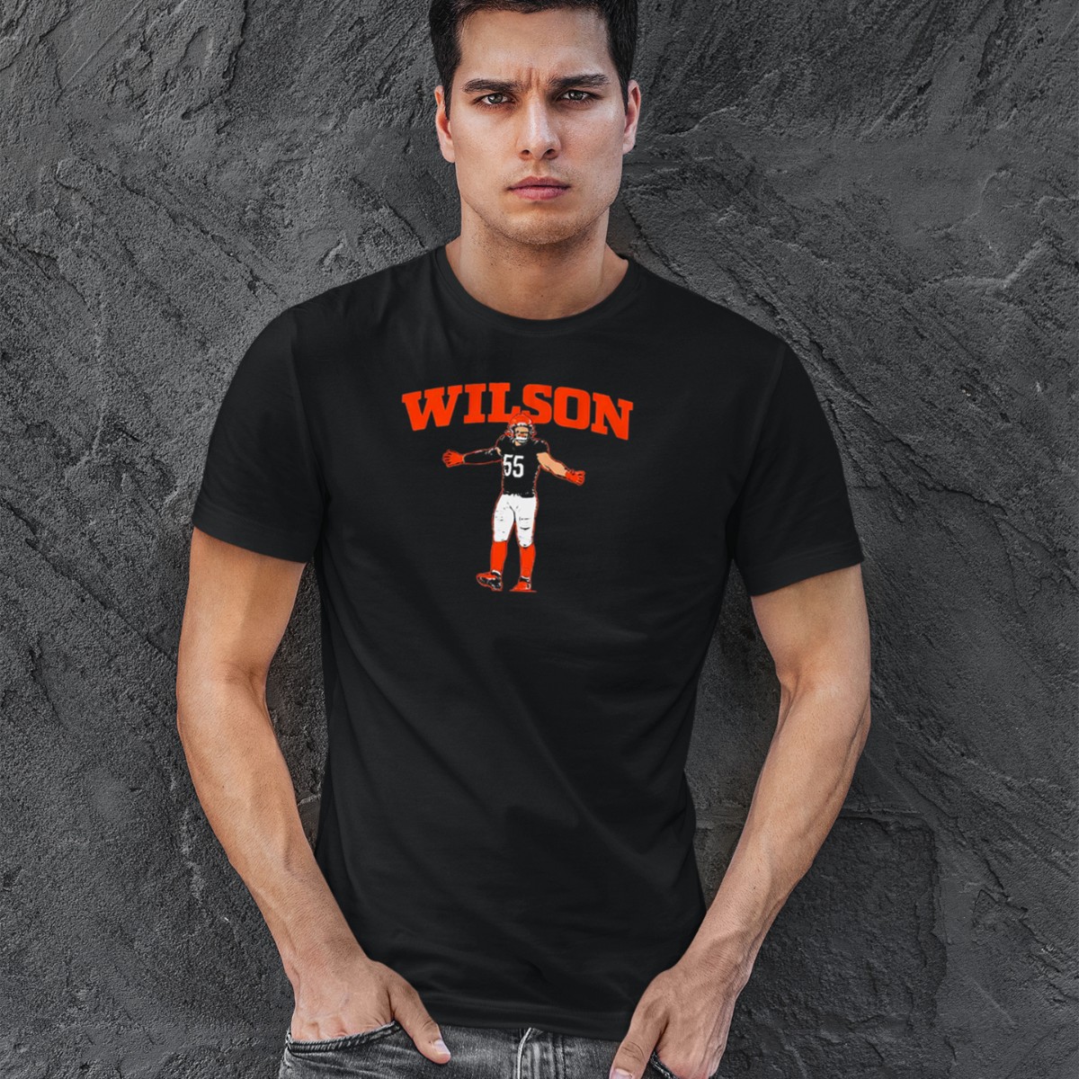 Show your unwavering support for the Cincinnati Bengals with the Wilson 55 Football Hero T-Shirt! This fan-made design is perfect for die-hard fans and casual supporters alike, making it an ideal choice for game days, themed events, or simply showcasing your team pride every day. Crafted for comfort and style, this shirt combines a classic fit with a soft and breathable fabric, ensuring you stay comfortable while cheering on your favorite team.