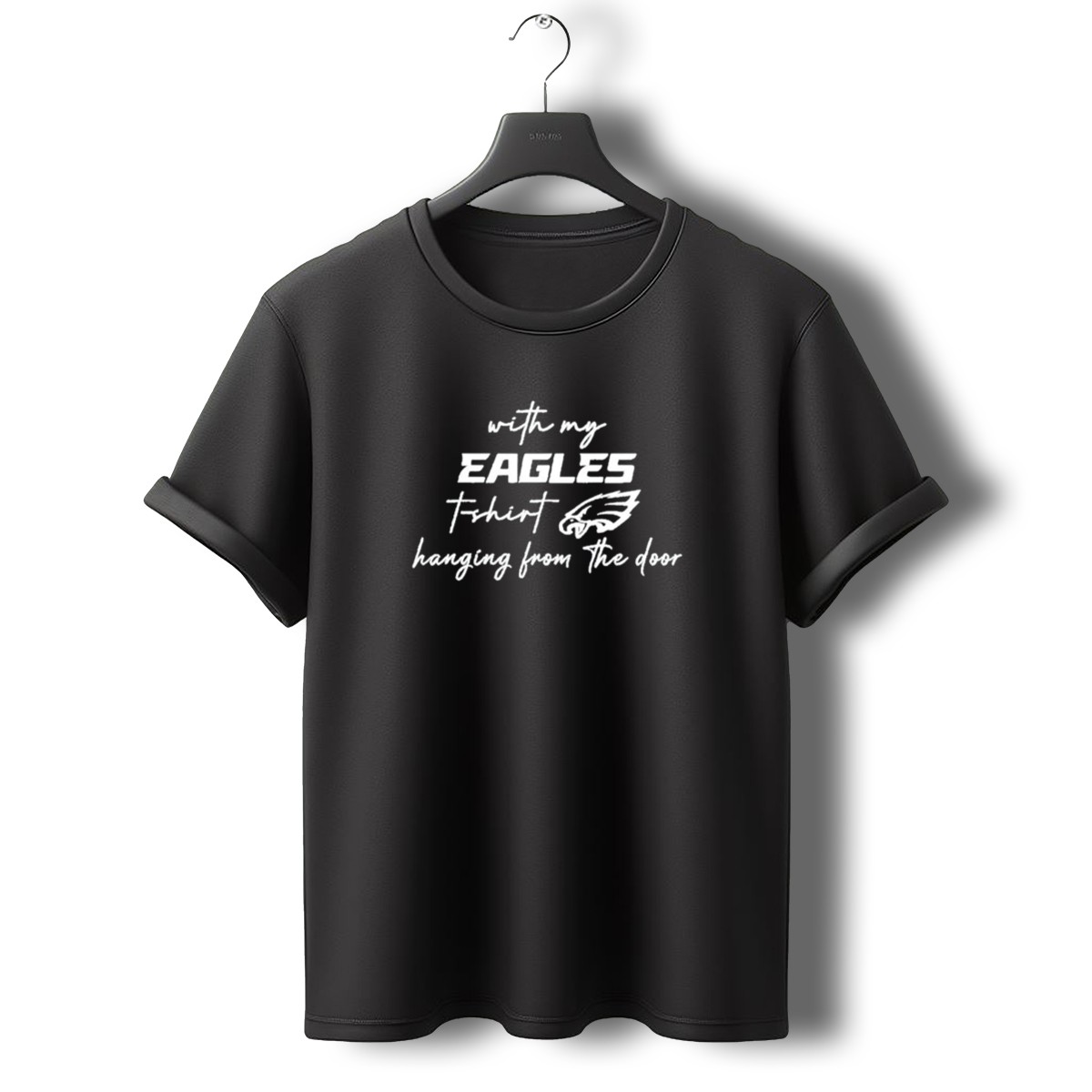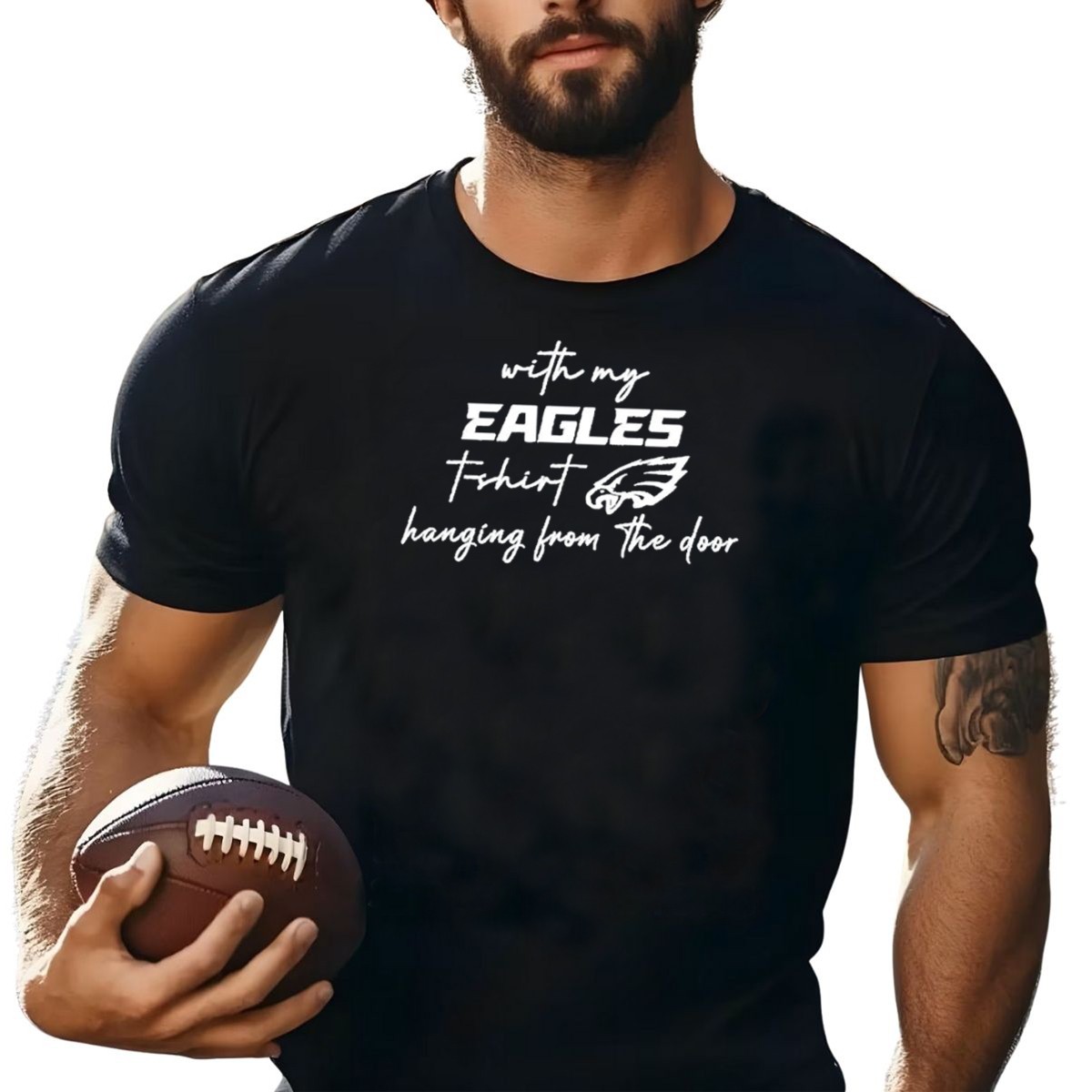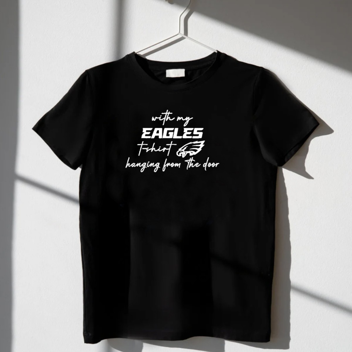 Show your unwavering support for the Eagles with our “With My Eagles T Shirt Hanging From The Door” tee! Perfect for fans who love to express their team spirit, this shirt is ideal for casual outings, themed events, or relaxing at home. Made with a fan-made design printed in the USA, it combines comfort and style, making it a must-have addition to any Eagles enthusiast’s wardrobe.