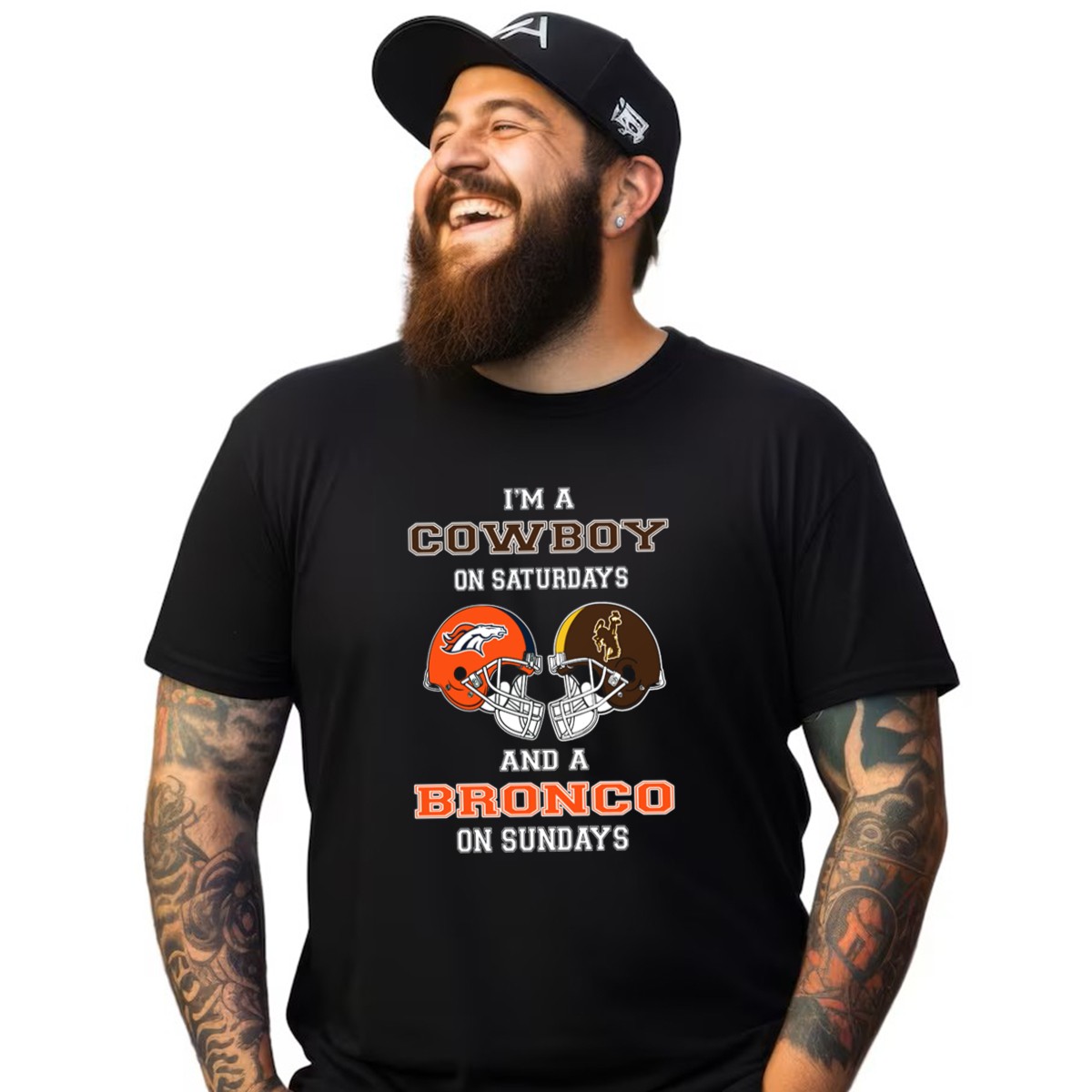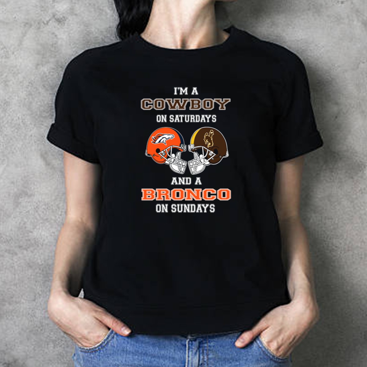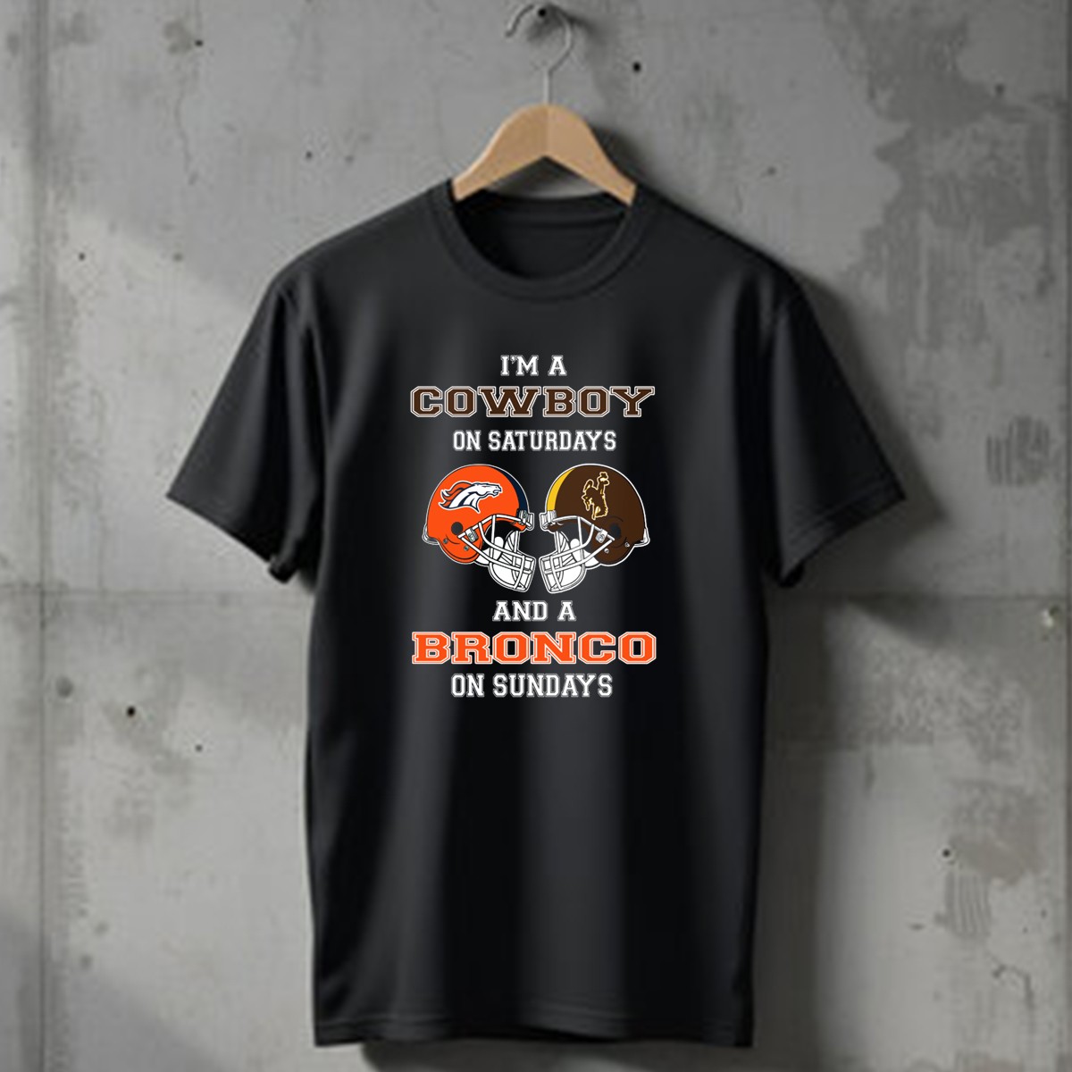 Show your unwavering support for your favorite teams with our Wyoming Cowboys Saturdays Denver Broncos Sundays T-Shirt! Perfect for sports fans who live for game day, this fan-made design celebrates the thrill of college and professional football. Whether you’re tailgating, cheering from the stands, or enjoying a casual day out, this shirt combines comfort and style to keep you in the game all season long.