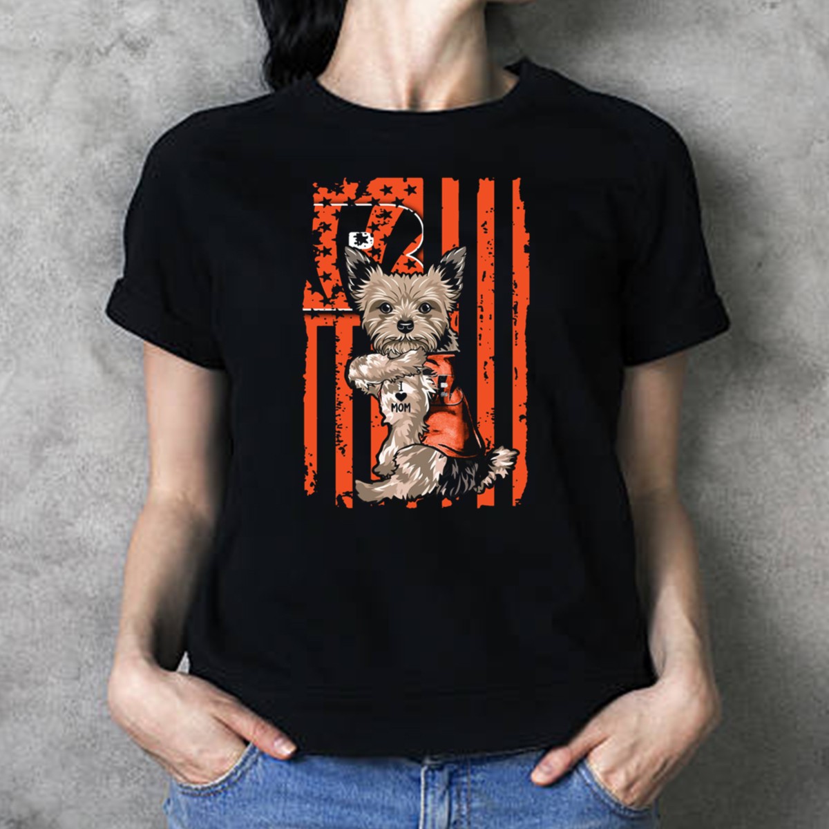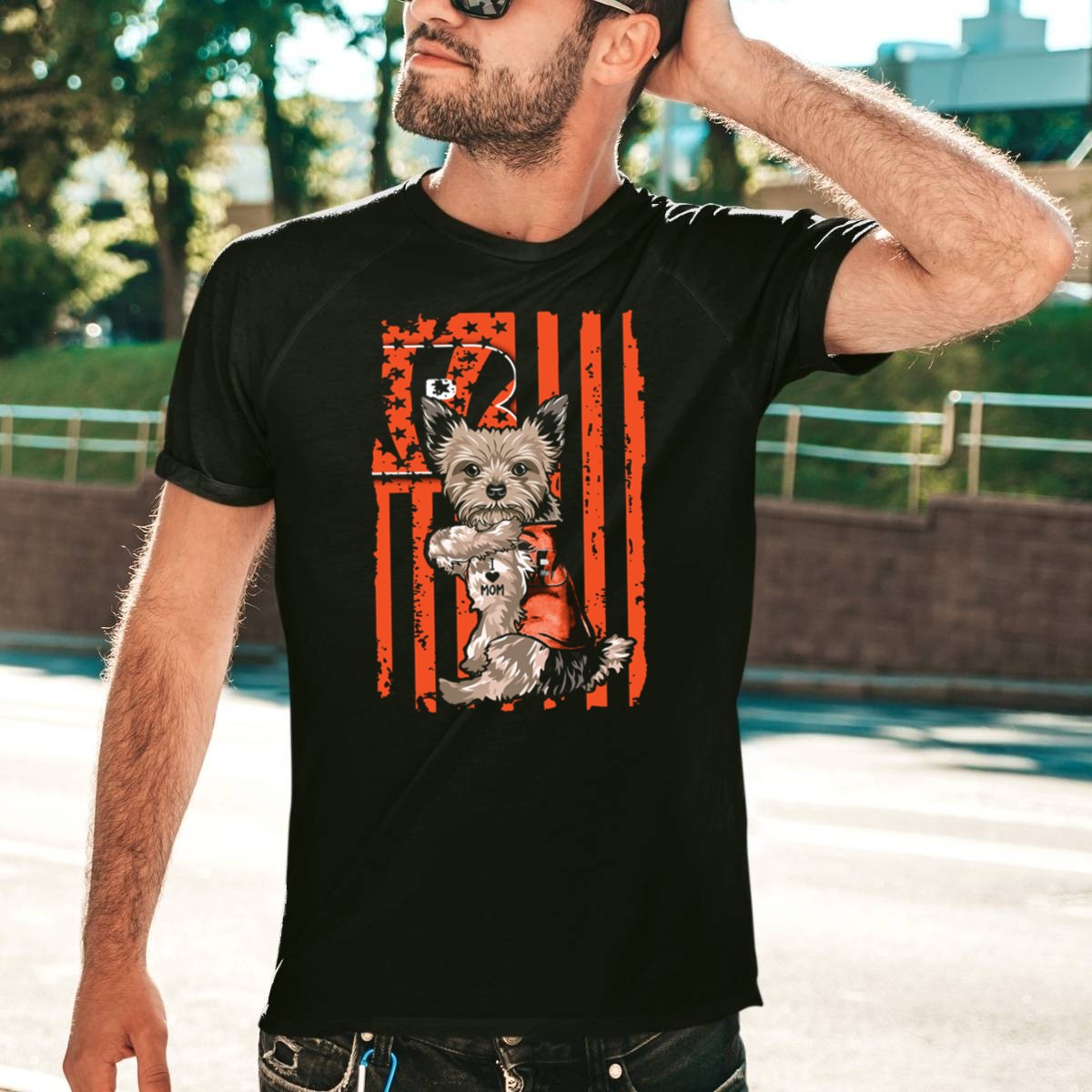 Show your love for your furry friend and your favorite team with our Yorkshire Terrier I Love Mom Cincinnati Bengals Fan T-Shirt! This shirt is perfect for dog lovers and Bengals fans alike, making it an ideal choice for casual outings, game days, or themed events. Crafted with a unique fan-made design, this T-shirt not only celebrates your passion for the Cincinnati Bengals but also showcases your adoration for Yorkshire Terriers in a stylish way, all printed right here in the USA.