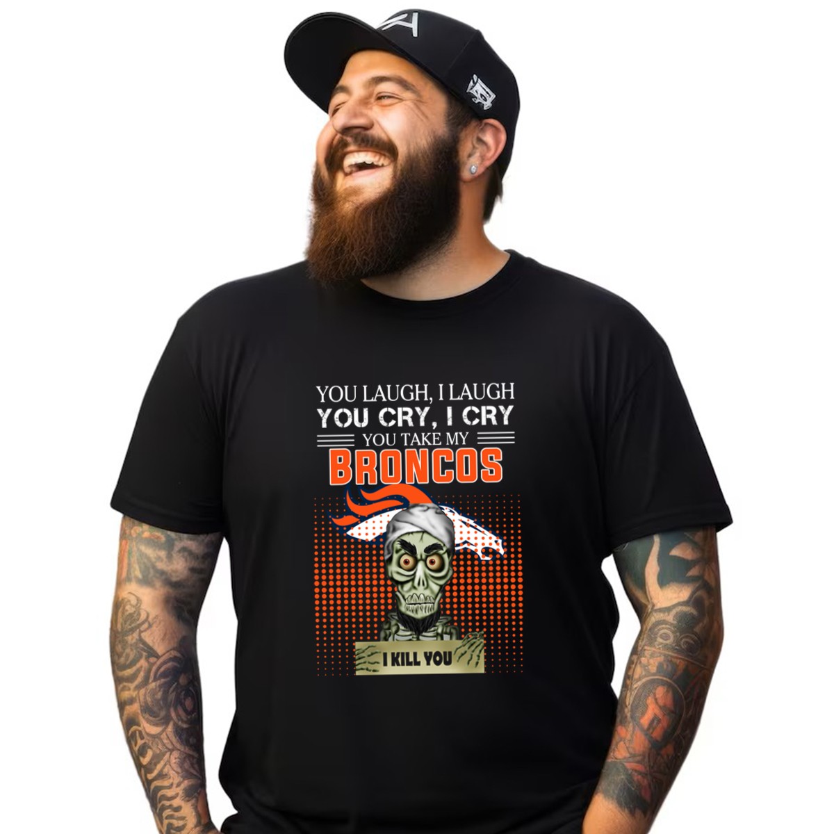 Show off your team spirit with our “You Laugh I Laugh Cry Denver Broncos I Kill You” T-Shirt, the perfect addition for die-hard Broncos fans! This fan-made design is ideal for casual outings, game days, or themed events, making it a versatile choice for any occasion. Crafted with comfort in mind, this shirt combines a fun graphic with the classic style you love, allowing you to express your passion for the Denver Broncos in a unique and humorous way.