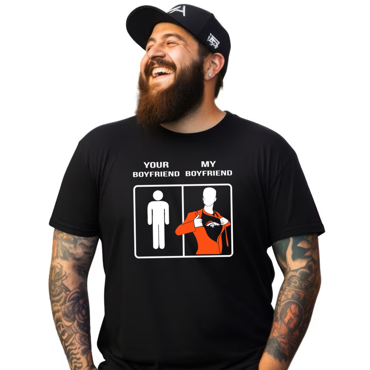 Show your team spirit and playful side with our “Your Boyfriend My Boyfriend” Denver Broncos T-Shirt! This fan-made design is perfect for die-hard Broncos supporters and makes a fun statement at casual outings, themed events, or just everyday wear. Crafted for comfort and style, this T-shirt will quickly become a favorite in your wardrobe, allowing you to cheer on your team in style.