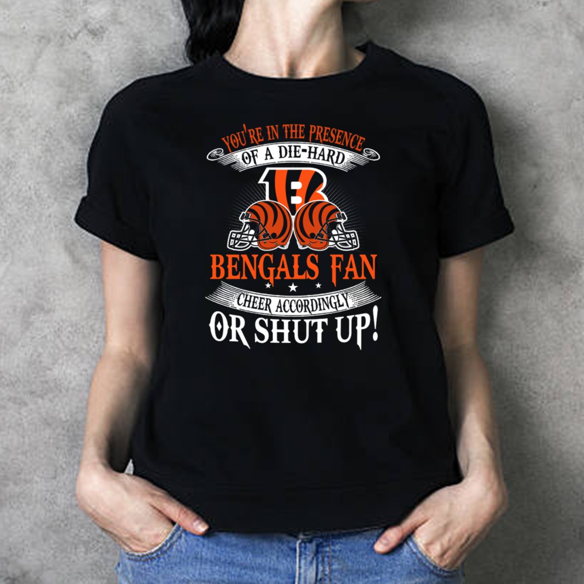 Show off your unwavering support for the Cincinnati Bengals with our “You’re In The Presence Of A Die Hard Cincinnati Bengals Fan Cheer Accordingly Or Shut Up” T-shirt! Perfect for true fans, this shirt is designed for any occasion, whether you’re at a game, a themed event, or just enjoying a casual day out. Made with a fan-made design and printed in the USA, it’s not just a piece of clothing; it’s a statement of loyalty and pride that sets you apart from the crowd.